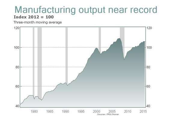 It’s well-known among people who bother to learn the facts that U.S. manufacturing output continues to rise despite the reality that the number of Americans employed in jobs classified as being in the manufacturing sector peaked in June 1977 and has fallen, with very few interruptions, ever since.