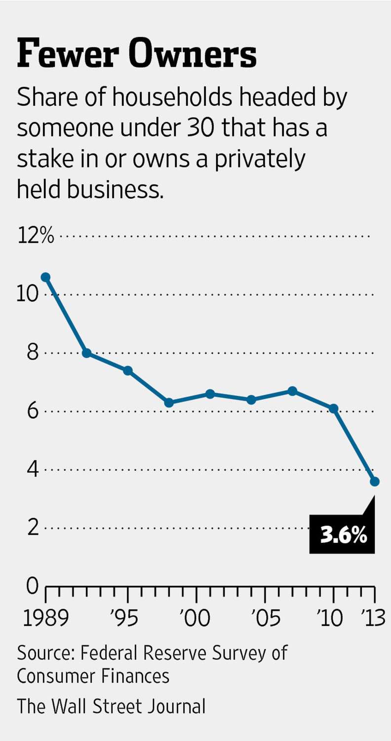 Roughly 3.6% of households headed by adults younger than 30 owned stakes in private companies, according to an analysis by The Wall Street Journal of recently released Federal Reserve data from 2013. That compares with 10.6% in 1989—when the central bank began collecting standard data on Americans’ incomes and net worth—and 6.1% in 2010.