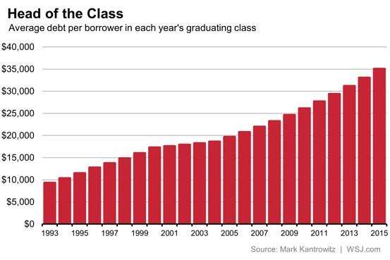 Increasing costs of college combined with easy-money from government-backed agencies and banks have made it that around 71 percent of graduates in 2015 had student loans (up from 64 percent in 2005 and up from < 50 percent 20 years ago). The average borrower in 2015 has more than $35,000 in student loan debt. (source) And the trends are just pointing to these numbers increasing.
