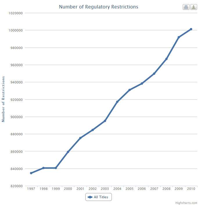 Americans today are the most regulated and taxed in the country’s history. While some tax rates have dropped in recent years, they’ve been offset by increases elsewhere and the unprecedented and massive growth in the bureaucracy. It’s harder today to simply start a business because of the number of regulations with which one must comply. It was once possible to start a business whenever you realized you were on to something that solved problems for people and for which they would pay you, but the immense regulation of small businesses today makes the barrier to entry so much higher that plucky young upstarts are much less likely to be able to get off the ground.