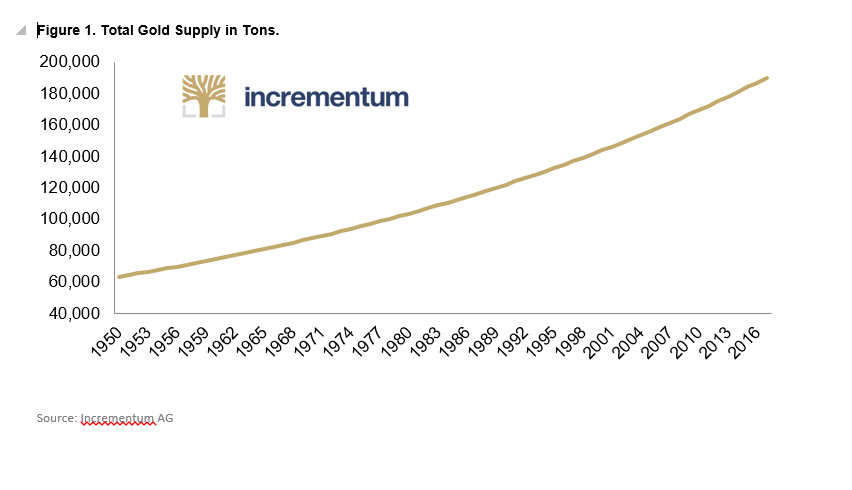 Gold is considered the ultimate store of value because of one specific characteristic: scarcity. No person or group can will gold into existence. Instead, the supply is controlled by nature. Figure 1 (above) shows the supply of gold has had a stable inflation rate. The creators of Bitcoin designed its inflation rate to mimic gold’s stable inflation rate.