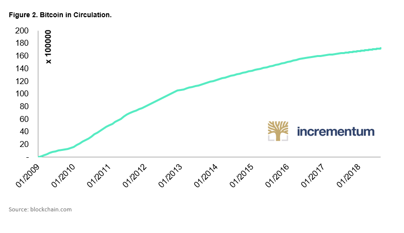 Figure 2 (below) shows the circulating Bitcoin since its creation in 2009. As the inflation rate decreases, the price for each Bitcoin should increase, ceteris paribus. Bitcoin’s inflation rate was hardcoded into the software that operates Bitcoin. Hardcoding Bitcoin’s inflation is similar to Milton Friedman’s K percent rule that called for an algorithmic and regulated inflation rate that would eliminate human-error and the temptation to manipulate the monetary base for political reasons. However, Bitcoin’s inflation algorithm was designed to make Bitcoin even scarcer than gold.