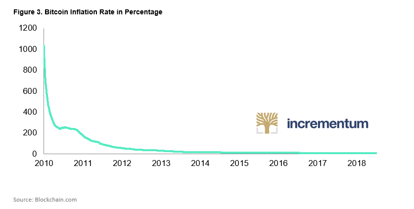 There is a fixed amount of 21 million Bitcoin that can be minted, which means that no coins can be minted once this amount is reached. Approximately 80 percent of the total amount of Bitcoin has already been minted. Bitcoin’s algorithmic inflation rate since 2010 is displayed in Figure 3 (below) and is explained in the original white paper written by Satoshi Nakamoto.