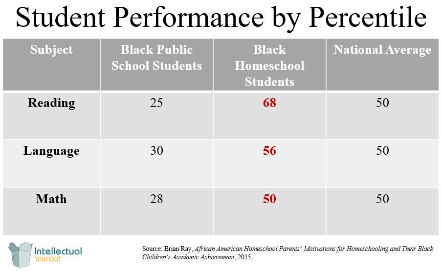 As Dr. Fields-Smith explains, public schools offer a “basic education” to every child. Homeschoolers, however, are able to help their children rise above the label of average. Evidence of this was revealed in a 2015 report by Dr. Brian Ray, who found that homeschooled black children register in a percentile above the national average and far above their black public school peers: