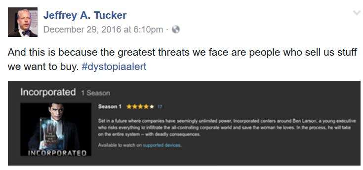 It brought to mind a recent post Jeffrey Tucker shared on his Facebook page regarding a new TV show called Incorporated. The show, produced by Ben Affleck and Matt Damon, takes place in a dystopian future in which governments have collapsed (because climate change) and corporations now run the world.