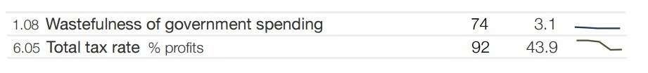 The US gets a poor score for wasteful spending and a terrible score for the punitive taxation of profits.