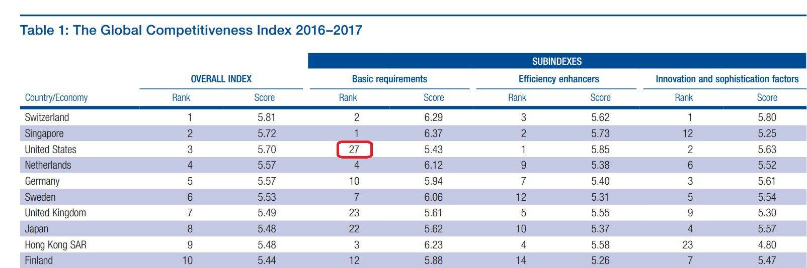 The United States has a mediocre score for “basic requirements,” the area where government policy plays a big role.