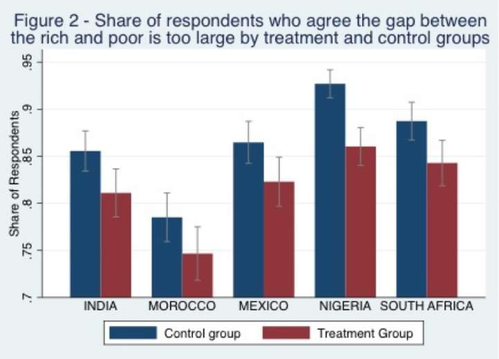 I conducted the first cross country survey experiment on preferences for redistribution in the developing world… The experiment involved over 16,000 respondents in five developing countries that make up almost 25% of the global population (India, Nigeria, Mexico, South Africa and Morocco). …To test whether informing poor people of their relative position in the national income distribution makes them more supportive of redistribution, I randomly allocate half of the respondents in each country to be told which quintile their household belongs to in the national income distribution (based upon their reported household income and the number of household members). …After the treatment they were asked if they thought the gap between the rich and poor was too large and whether the government was responsible for closing this gap.