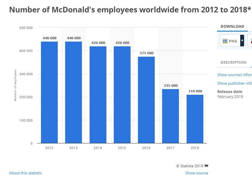This is hardly news. What I found surprising was that the fast food giant’s trend of reducing its labor force was well underway before this announcement. Data show that McDonald’s slashed its labor force by more than 50 percent from 2013 to 2018, from 440,000 to 210,000, despite adding thousands of restaurants (see Chart 2) around the world.*