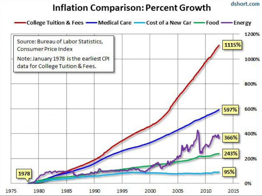 But given that college costs have risen at a far greater rate than other costs (chart below), will transferring the tuition payments from the individual to the taxpayer really solve the problem? Should we instead consider that colleges are offering students a product worth far less than they’re selling it for?