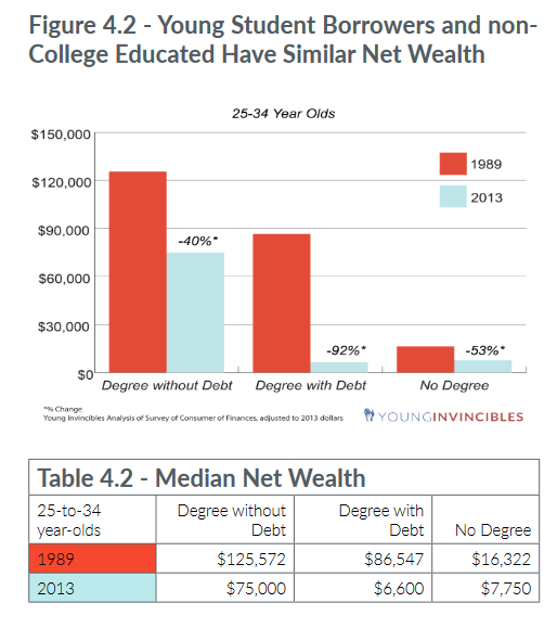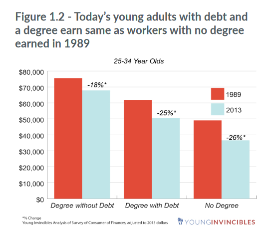 According to the Young Invincibles, research shows that “young adult workers today earn $10,000 less than young adults in 1989, a decline of 20 percent.” The study is quick to note that “a college degree – with or without debt – is still worth it.” It goes on, however, to say: