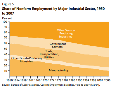 The US is moving from an economy where most people work in agriculture and manufacturing, to one in which most of the jobs are in information and services.