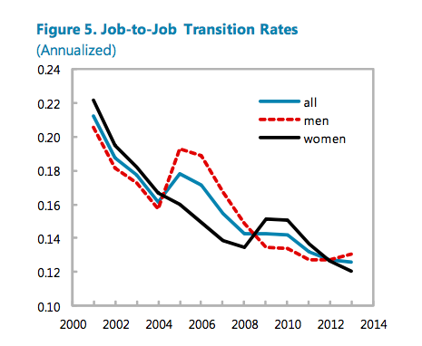 Job lock is indeed a huge problem in American labor markets today, and Obamacare and hyper-regulation of the labor markets has made it worse. Economists have shown that a higher rate of job-to-job transition (the quit rate) is associated with higher earning relative to staying in one place. The IMF has done some remarkable number-crunching to discover what is happening to the American quit rate, and found that it has been in free fall.