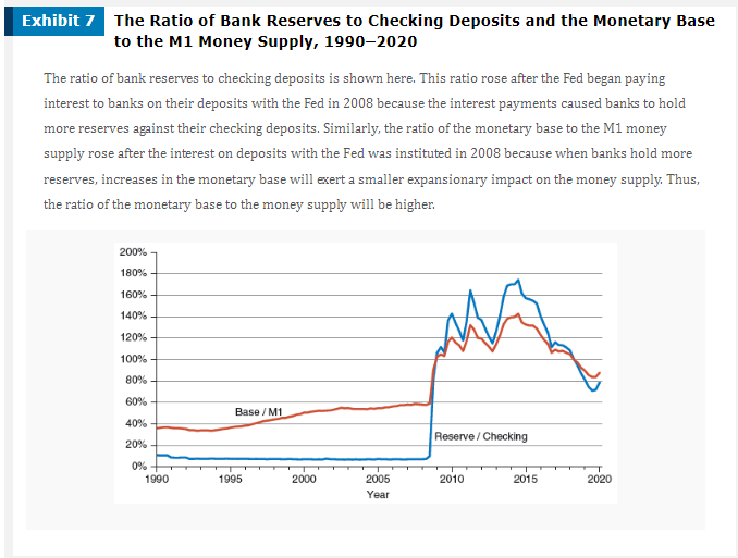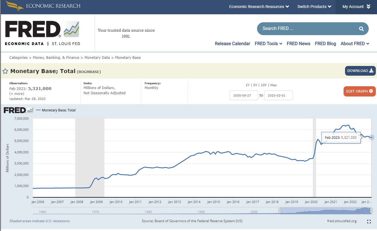 After the financial crisis, the Fed added a new tool to control the supply of money. The Fed now pays interest to banks for money they do not lend out to private individuals and businesses. Economists call this tool interest on reserves. Banks now have an incentive to keep deposits with the Fed instead of lending them out to individuals and businesses because the deposits at the Fed pay risk-free interest of 4.9% as of April 2023. The bank’s “investment” is risk-free because the Fed can always print money to pay the interest to the bank (the bank can withdraw its deposit at the Fed anytime, and it is impossible for the Fed to default on its payment—they make the money!)