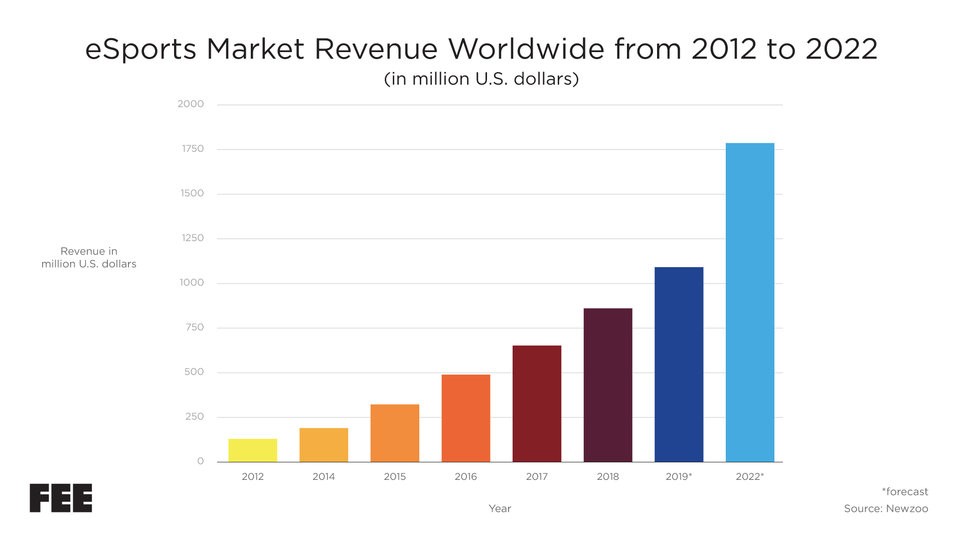This anecdote and other evidence suggest the US might simply be a few years behind the South Koreans when it comes to televised gaming. Esport revenue has surged in the US, reaching $1.1 billion in 2019, a nearly ten-fold increase from 2012. Revenues are projected to hit $1.8 billion by 2022, but many analysts believe that projection is conservative.