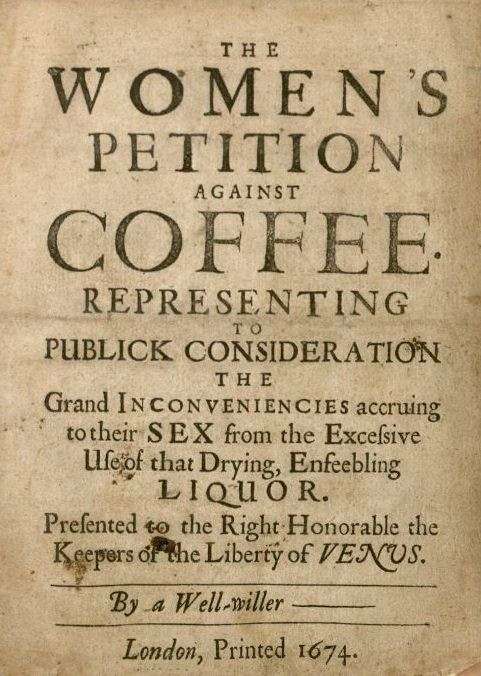 Women who were banned from coffee houses developed a very clever response. In the famous “Women’s Petition Against Coffee” of 1674, women said that coffee was responsible for the “enfeeblement” of men. Historians say the campaign contributed to the gender integration of coffee houses.
