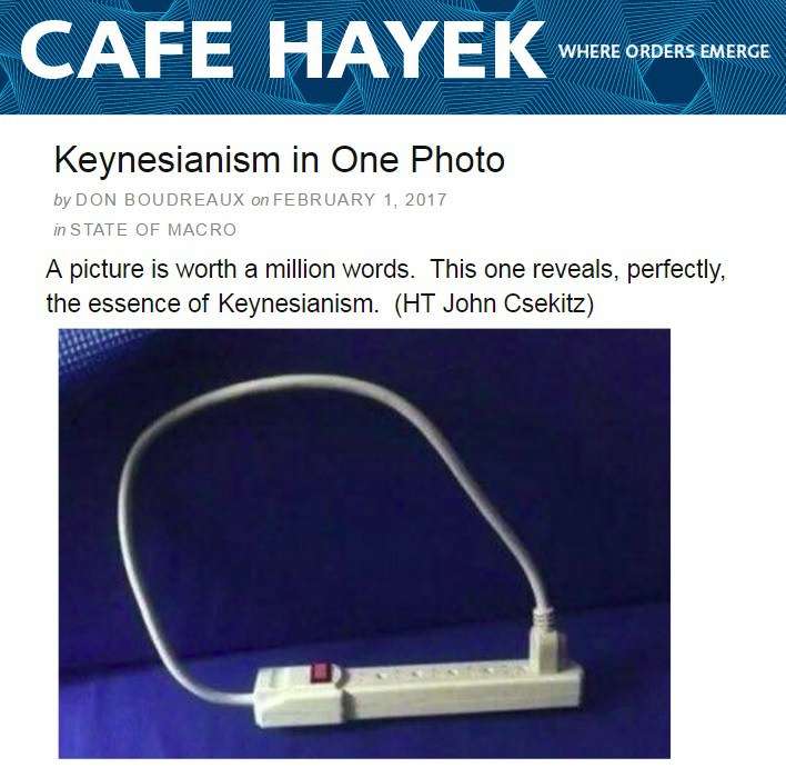 Expanding on this theme, here’s a new addition for our collection of Keynesian humor. It’s courtesy of Don Boudreaux at Cafe Hayek, and it shows the Keynesian plan to charge the economy (pun intended). You don’t need to know a lot about electricity to realize this isn’t a very practical approach.