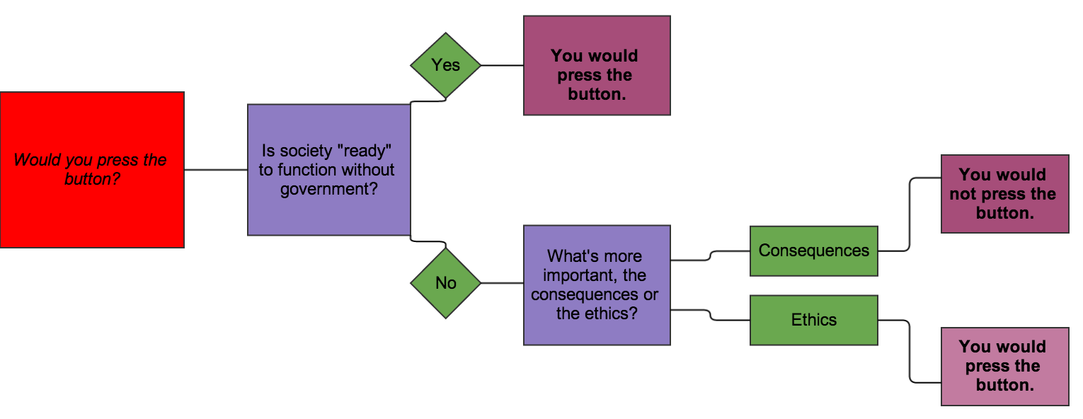 Now consider a question often discussed by radical libertarians: imagine that you have access to a button that when pressed would bring about the immediate end of government. Would you press it?