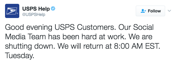 And J.Crew’s Help twitter page is full of glowing reviews. UPS’s page is similar, with the added plus of having personal initials at the end of each help tweet. Meanwhile, USPS’s Help page literally says in the main page description, “We apologize for response times as we are experiencing high volumes of traffic. Contact us at 1-800-ASK-USPS or visit us at http://www.usps.com/help,” and all of their tweets but one say the exact same thing: