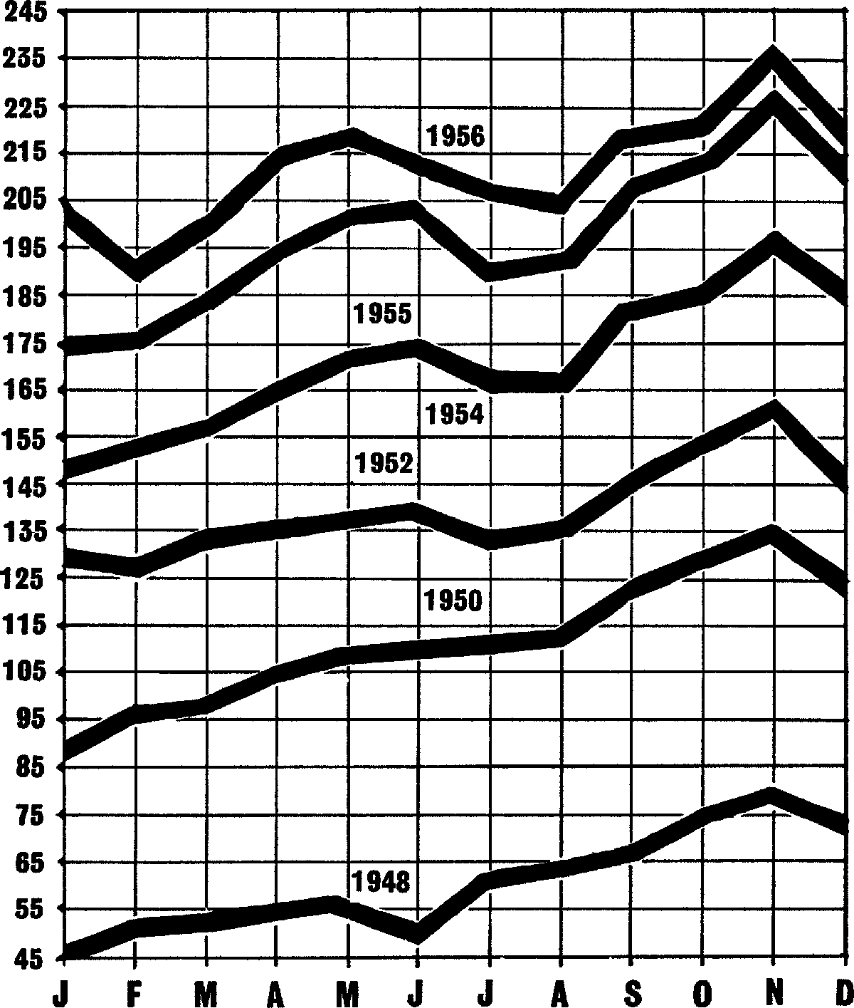 | 1954 | 1 quarter | 153.4 | 137.1 | 182.3 | 154.5 |