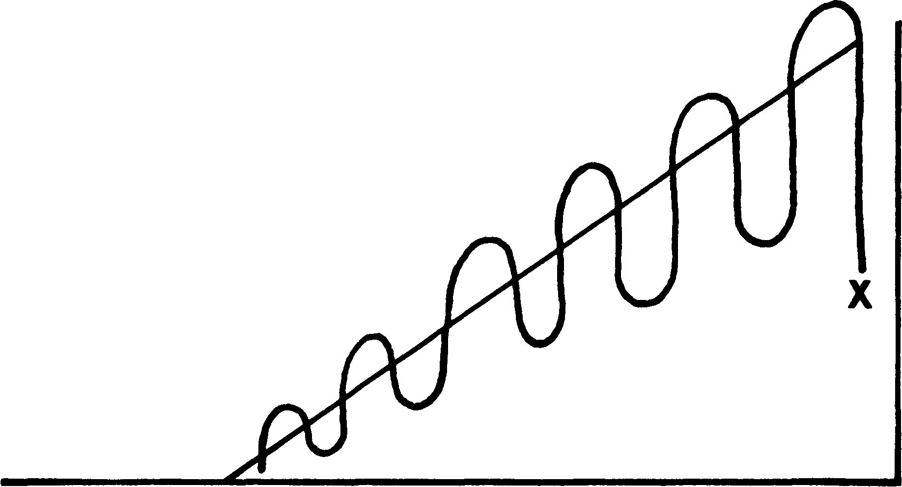 To dramatize the point, put a powerful magnifying glass on this line and have a look at its interior: the detail, the trees in the forest, a look at what a few individuals have seen during the past. The interior would show evolution and devolution in a sequence, evolution inching ahead over the millennia:
