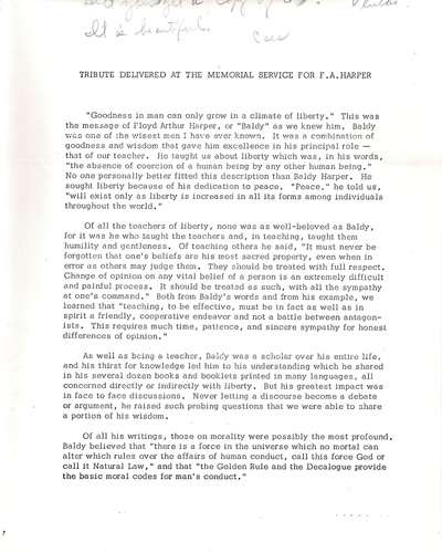 Charles Koch's Eulogy of Baldy Harper, April 1973 (Download PDF)