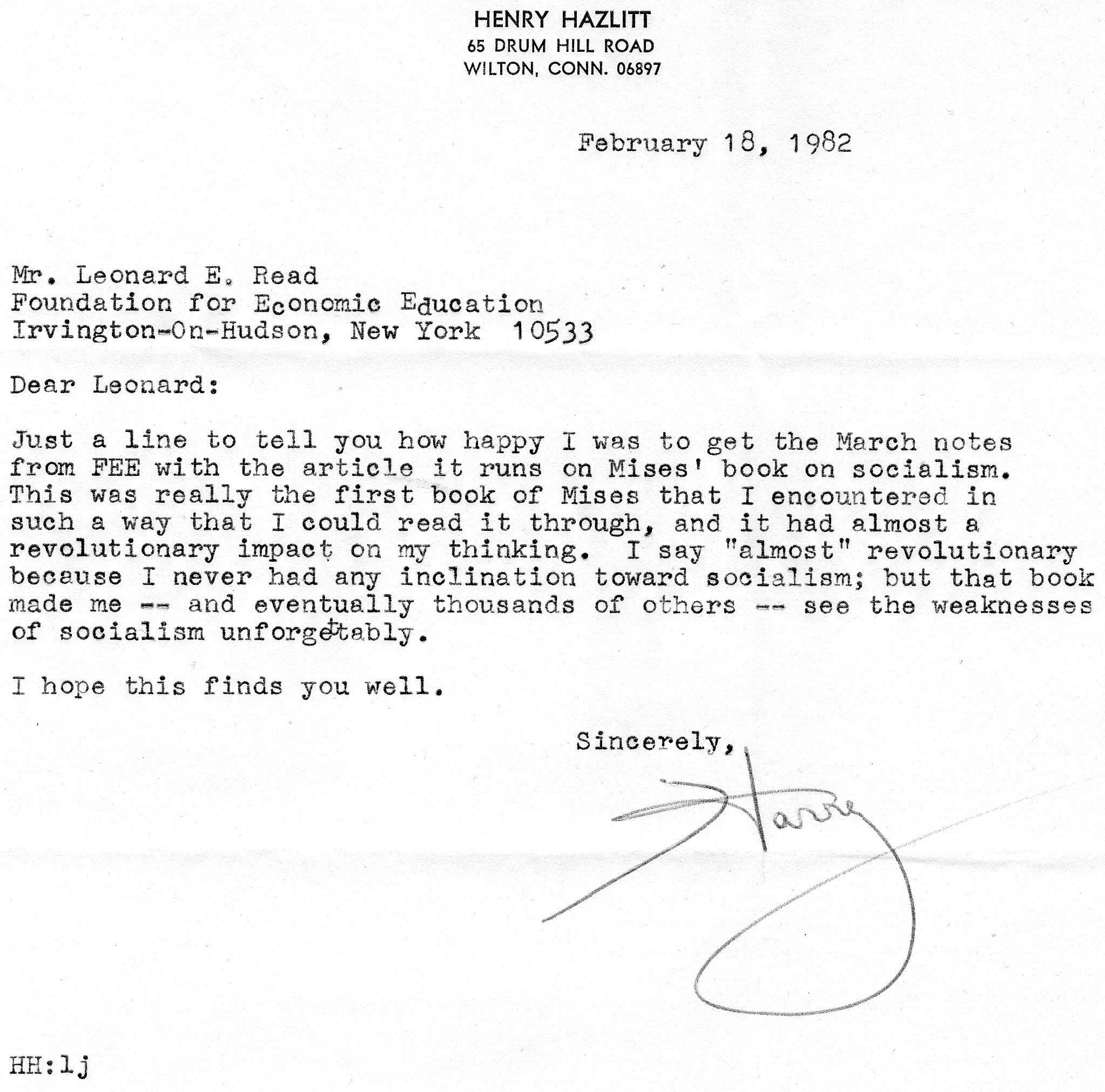 Letter From Henry Hazlitt to Leonard E. Read on February 18, 1982. Hazlitt Thanks Read for putting an article about Mises’s Socialism in the March Notes from FEE and then discusses the impact the book had on him.