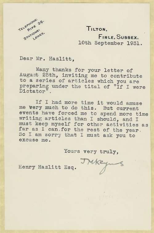 Letter from J.M. Keynes to Henry Hazlitt September 17, 1931, were Keynes turns down Hazlitt’s offer to participate in a series of articles entited, “If I were dictator.”