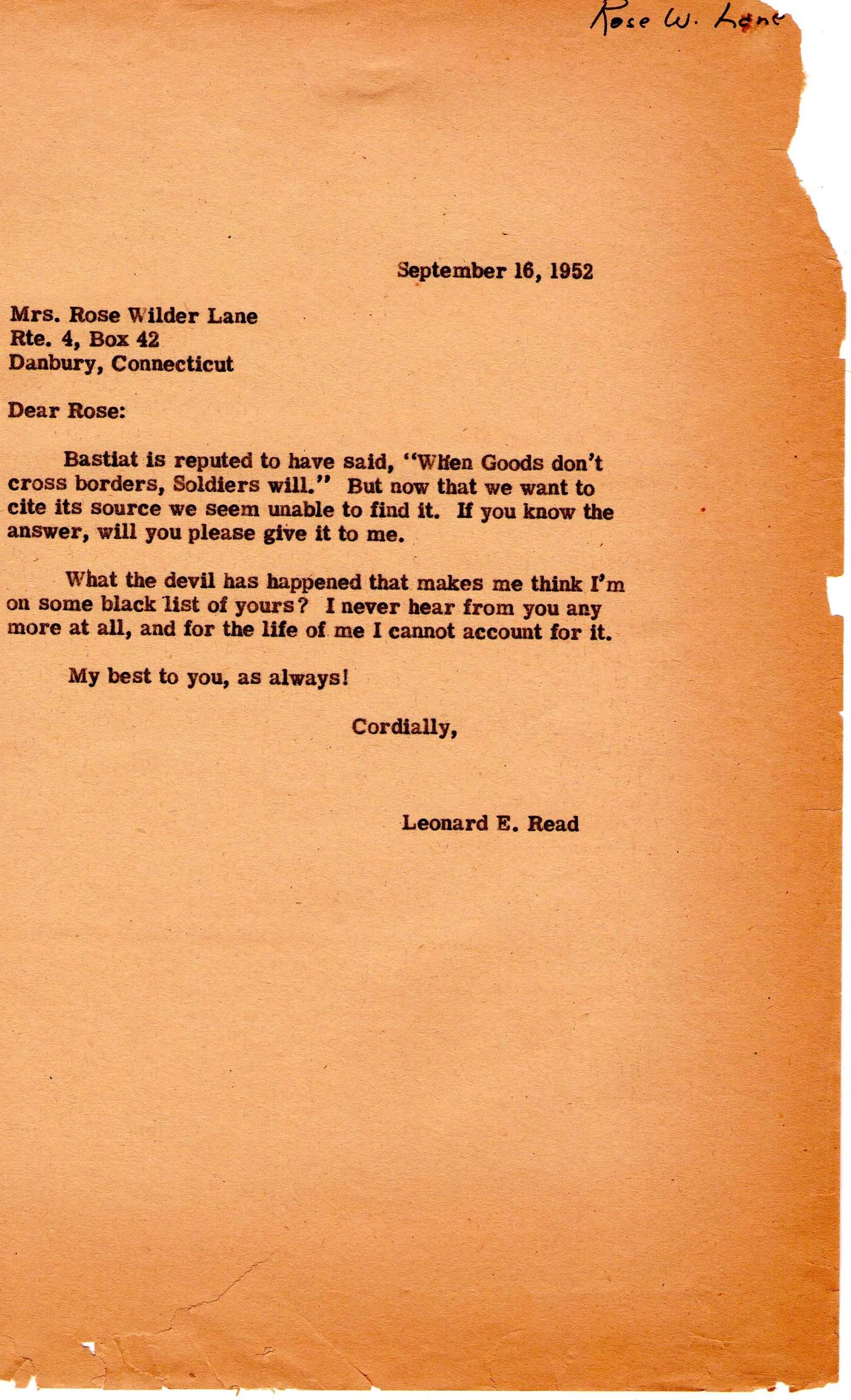 Letter From Leonard Read to Rose Wilder Lane on September 16, 1952. Read asks Lane for the source of the quote, “If goods don’t cross borders, soldiers will,” which is often attributed to Frederic Bastiat.