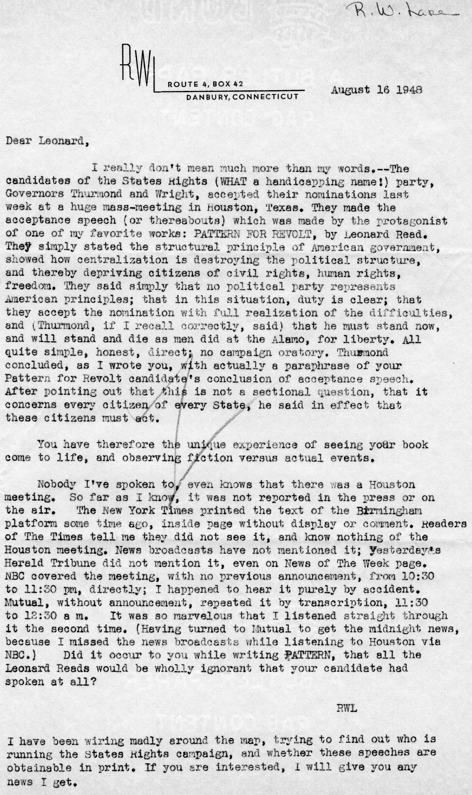 Letter From Rose Wilder Lane to Leonard Read August 16, 1948. Lane writes to Read about politicians who were influenced by Read’s book the Pattern for Revolt.