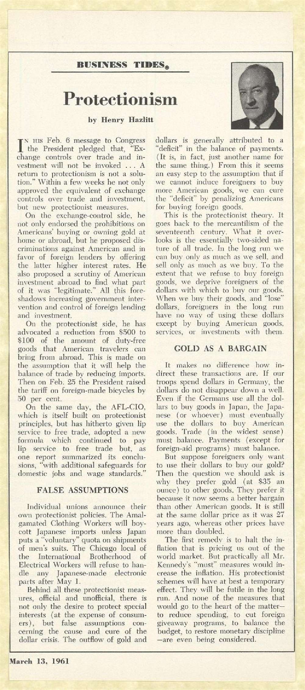 “Protectionism” by Henry Hazlitt. A March 13, 1961 Newsweek Business Tide Column about the fallacy of protectionism.